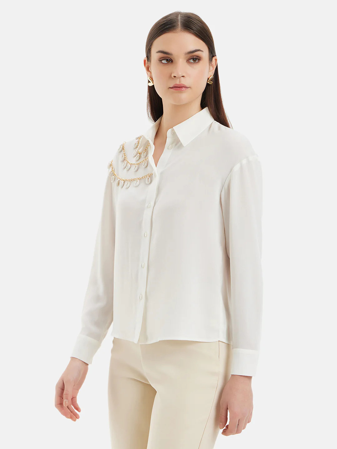 Introducing the Drop Shoulder Shirt With Embellished Chain Detail by Kazo! This fabulous shirt is perfect for those who want to make a statement. The embellished chain detail adds a touch of glamour and makes this shirt truly unique. The white color is crisp and clean, giving you a polished and sophisticated look. Made with high-quality polyester fabric, this shirt is not only stylish but also comfortable to wear. The solid pattern adds to the overall elegance of the shirt. It's versatile enough to be worn for both formal and casual occasions. Pair it with camel-colored trousers and a matching handbag for an office to party look that will turn heads wherever you go. Upgrade your wardrobe with this stunning Drop Shoulder Shirt and be the star of any event!