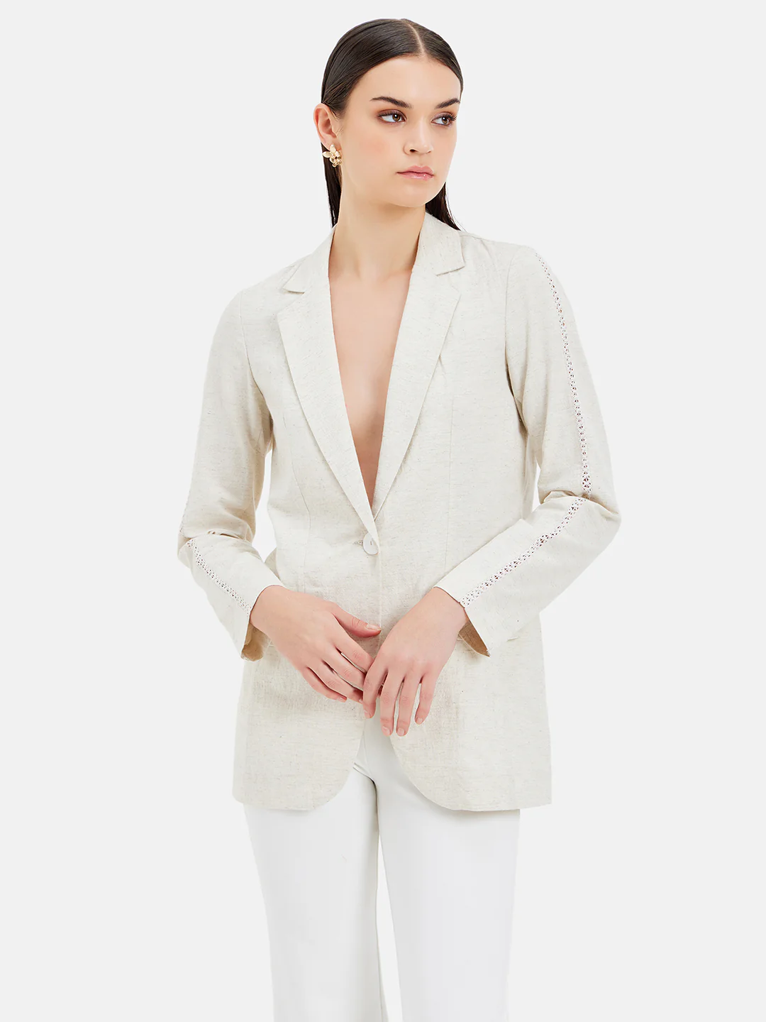The Blazer With Pockets And Lace Insert At Sleeves is perfect for any occasion, whether it's a formal event or a casual outing. Pair it with a crop top and a matching blazer for a comfy yet smart formal look, or dress it down with a plain white t-shirt and jeans for a more casual vibe.