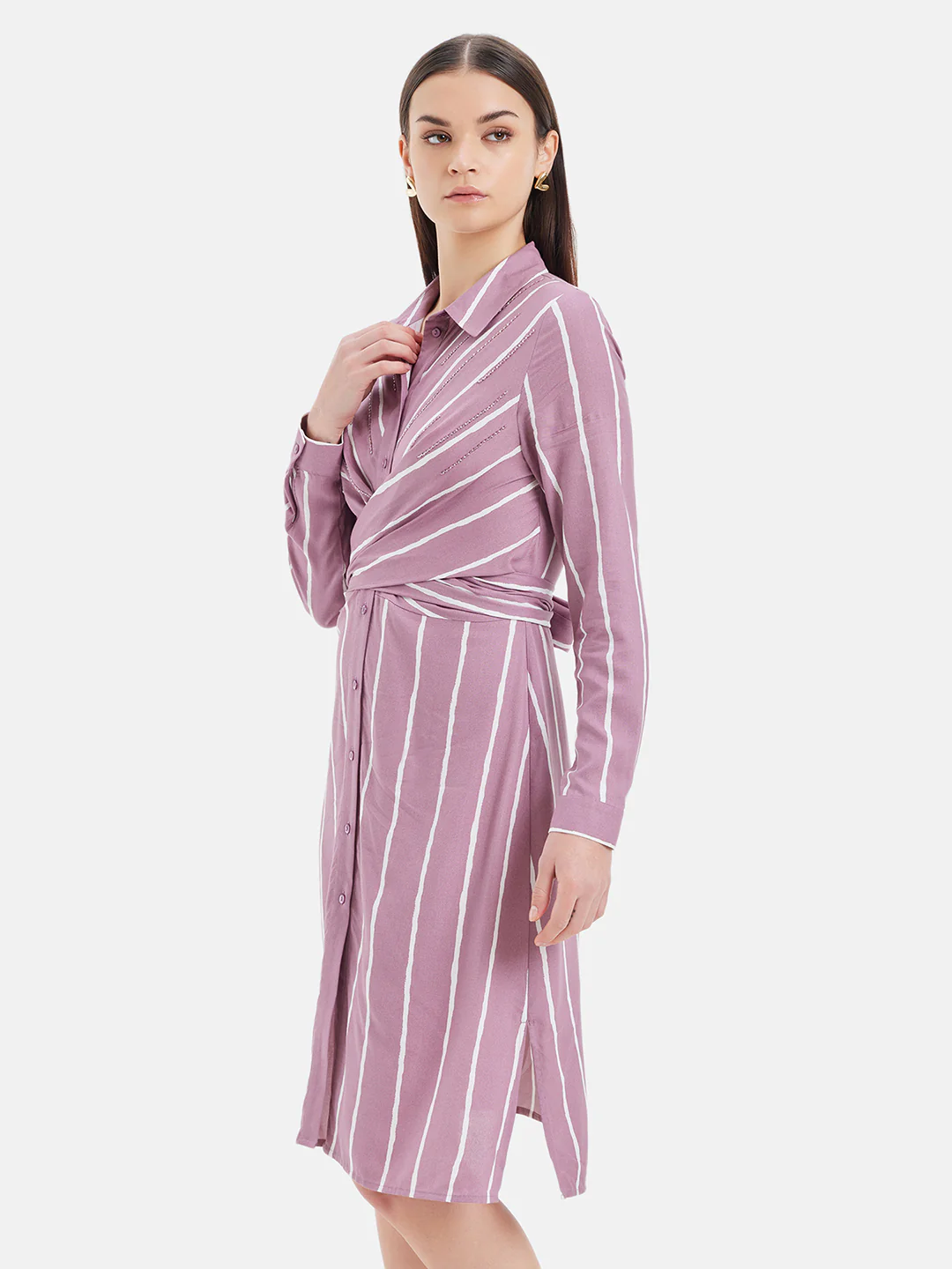 Introducing the Kazo Striped Shirt Dress With Tonal Embellishments And Wrap Tie-Up! This fabulous midi dress is perfect for adding some style to your work wardrobe. The dress features a chic mauve color and a striking striped pattern, making it a trendy and fashionable choice.Â