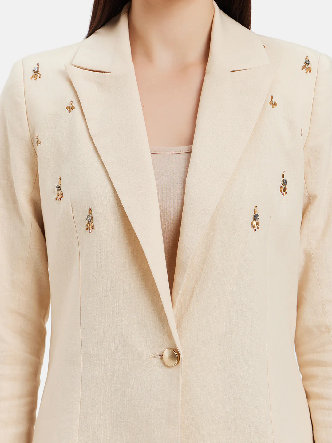 Introducing the stunning Hand Embellished Blazer by Kazo! This beige beauty is perfect for adding a touch of glamour to your look. Made with high-quality linen fabric, this blazer is both stylish and comfortable. The hand embellishments and sequined pattern give it a unique and eye-catching appeal, making you the center of attention wherever you go. Whether you're heading to work or a night out, this blazer is versatile enough to style with a crop top and denims for a trendy and chic look. Elevate your outerwear collection with this fabulous Kazo blazer. Get ready to turn heads and make a statement!