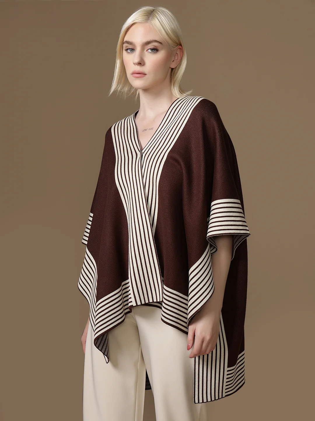 The Copa Cape in brown multi showcases striped detailing with an open front and relaxed fit an effortlessly chic winterwear layer that blends comfort with modern elegance.