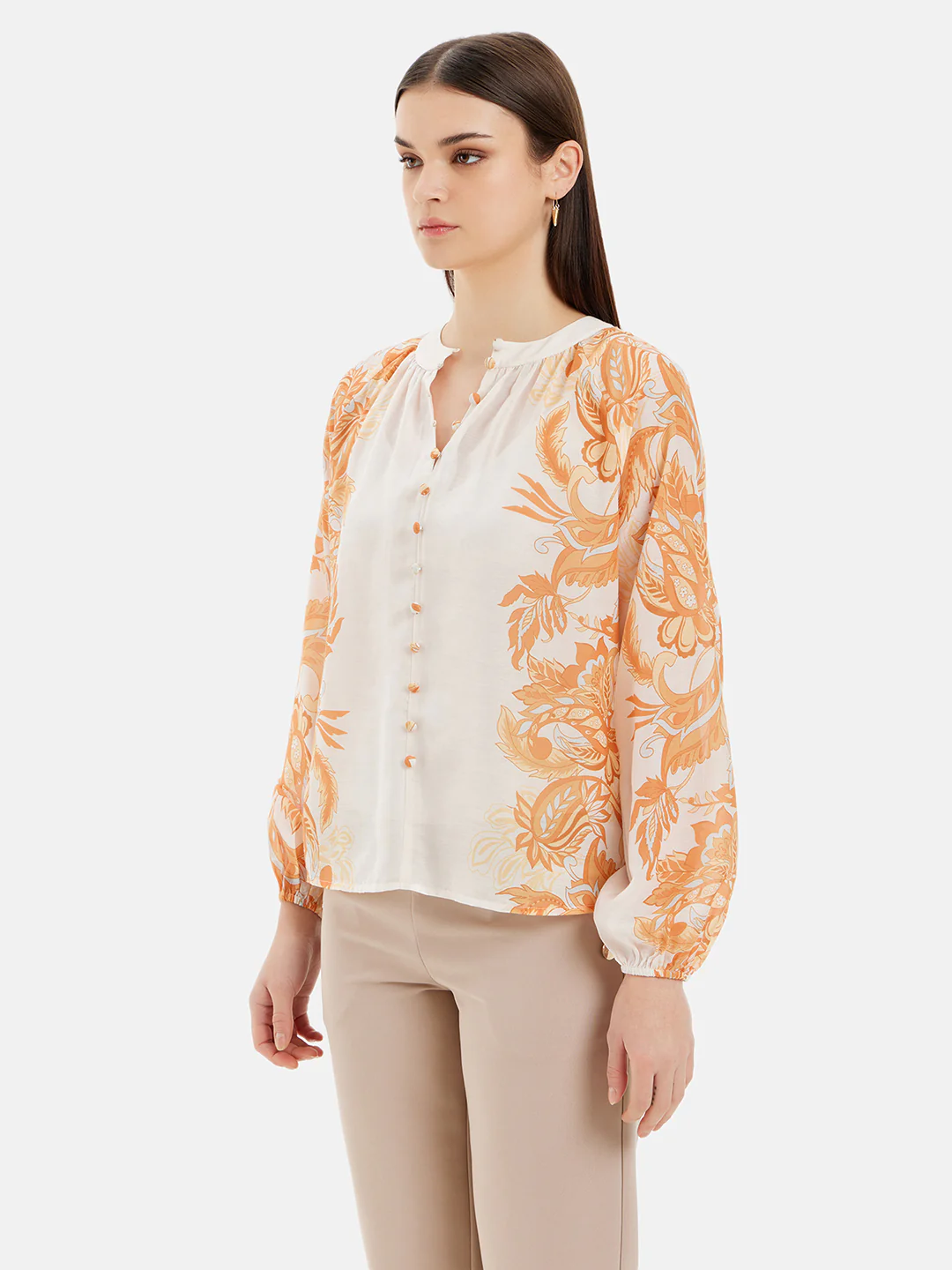 Whether you're going for a lunch date or a casual outing, pair it with white trousers and strappy heels for a chic and trendy look. Don't miss out on this must-have piece of topwear! Get your very own Placement Print Shirt With Puff Sleeves by Kazo today and make a fashion statement like never before.
