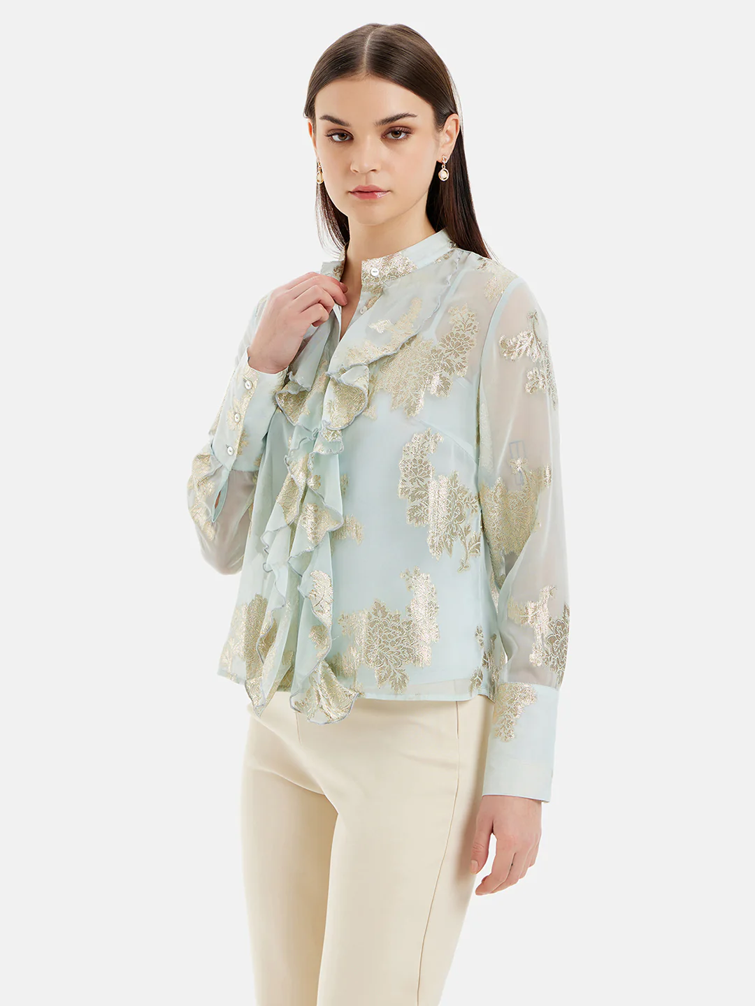 Introducing the stunning Lurex Jacquard Top with Ruffle Details! This beautiful top, brought to you by Kazo, is perfect for any occasion. The mesmerizing blue color will make you stand out from the crowd, while the ruffle details add a touch of elegance. Made from high-quality polyester fabric, this top is comfortable and stylish. The intricate jacquard pattern adds a unique twist to the design, making it a must-have for fashion-forward individuals. Whether you're attending a day party or heading out for a special event, this top can be effortlessly styled with white flared pants and strappy heels. Embrace your inner fashionista and get ready to turn heads with this amazing Lurex Jacquard Top!