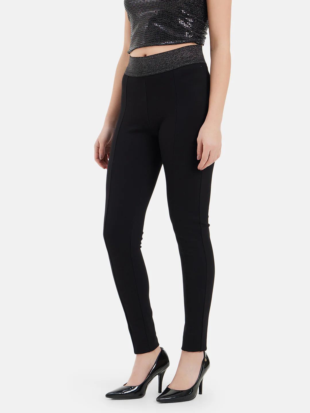 Introducing the Basic Stretchable Jegging with Elasticated Shiny Waistband by Kazo! This jegging is a must-have for any fashionista looking for both comfort and style. The elasticated shiny waistband adds a touch of glamour to the classic black color. Made with high-quality viscose fabric, this jegging is perfect for everyday wear. The solid pattern makes it easy to pair with any top and create endless outfit possibilities. Whether you're going for a casual look with a crop top and sneakers or dressing it up with heels and a blouse, this jegging is sure to make a statement. Shop now and add this trendy bottomwear to your collection!