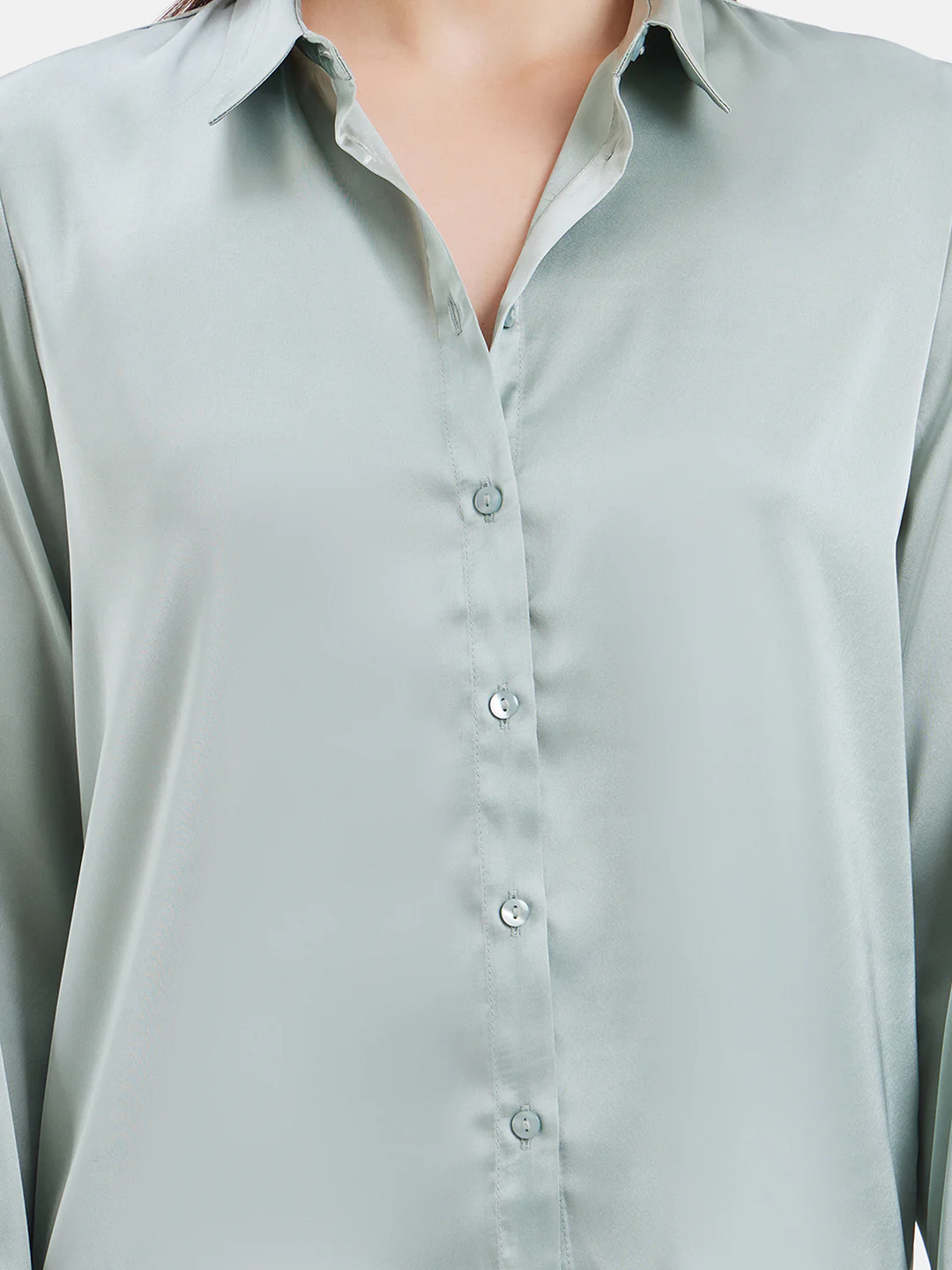 Introducing the Classic Satin Loose Shirt by Kazo! This trendy workwear essential is perfect for those who want to make a statement in the office. The green color adds a touch of elegance, while the satin fabric provides a luxurious feel. The solid pattern adds a touch of sophistication to your look. Pair it with formal trousers, pointed heels, and a handbag for a stylish and trendy work look. This shirt is a must-have in your topwear collection. Get yours today and elevate your style game!